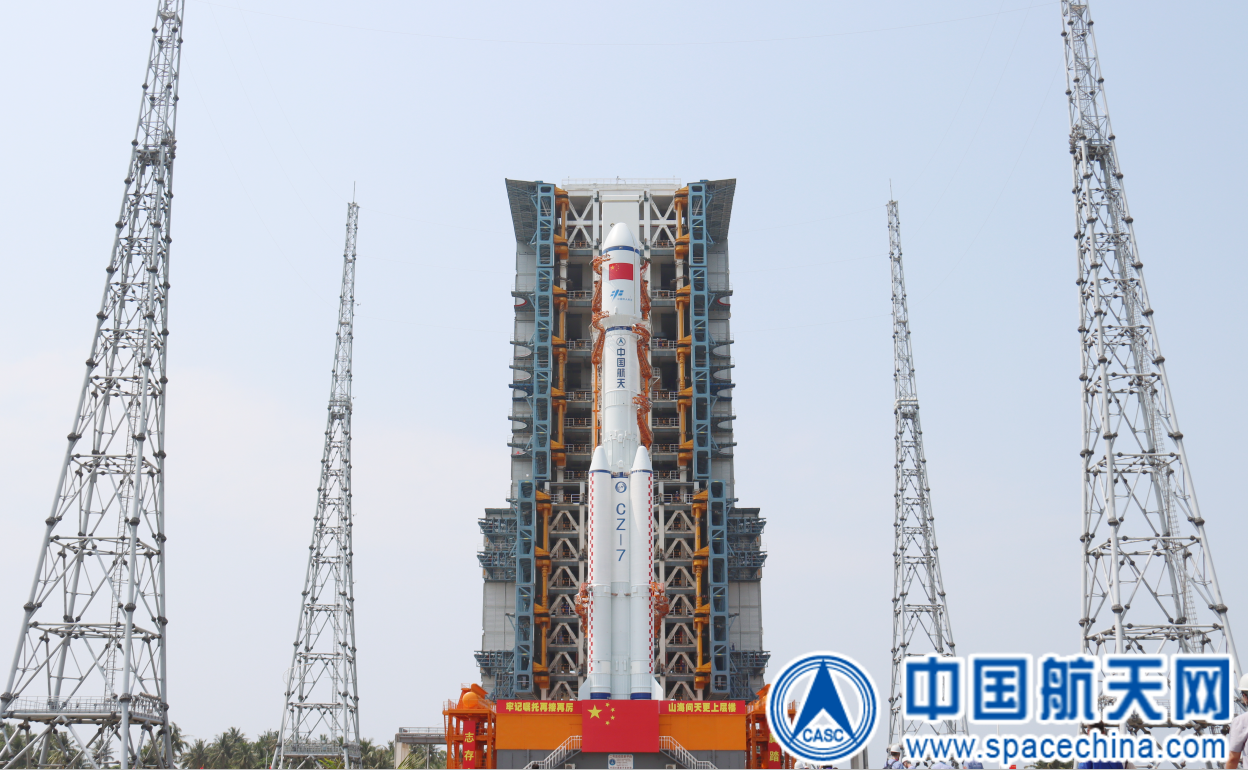 5月7日,由中国航天科技集团有限公司研制的天舟六号货运飞船与长征七号遥七运载火箭组合体垂直转运至发射区。
