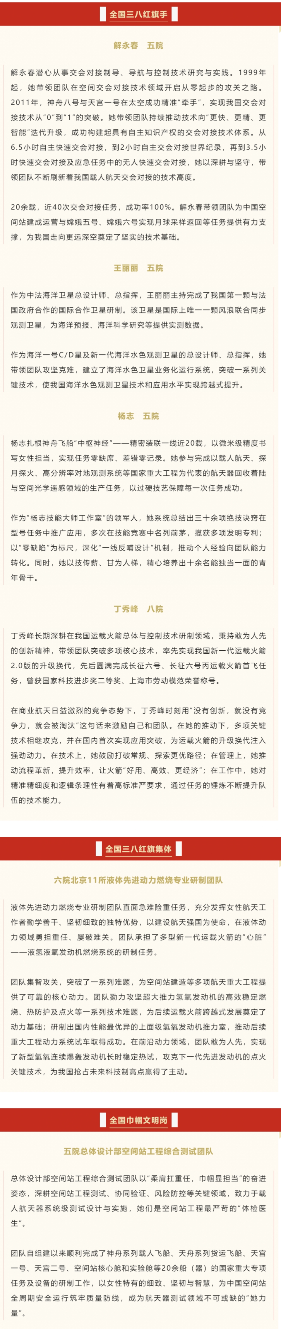 其中,八院张玉花被授予全国三八红旗手标兵称号;五院解永春、王丽丽、杨志,八院丁秀峰被授予全国三八红旗手称号;六院北京11所液体先进动力燃烧专业研制团队被授予全国三八红旗集体称号;五院总体设计部空间站工程综合测试团队被授予全国巾帼文明岗称号。